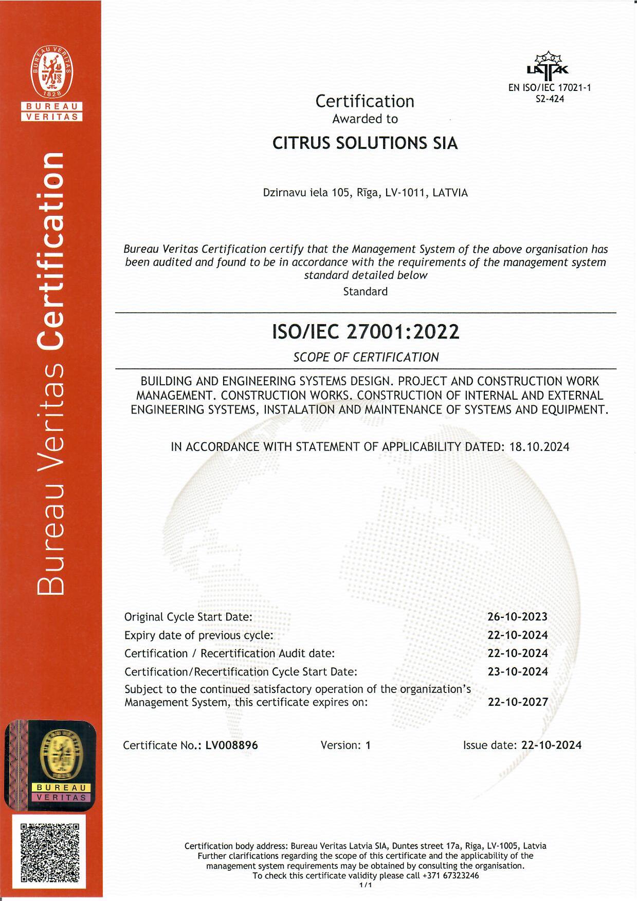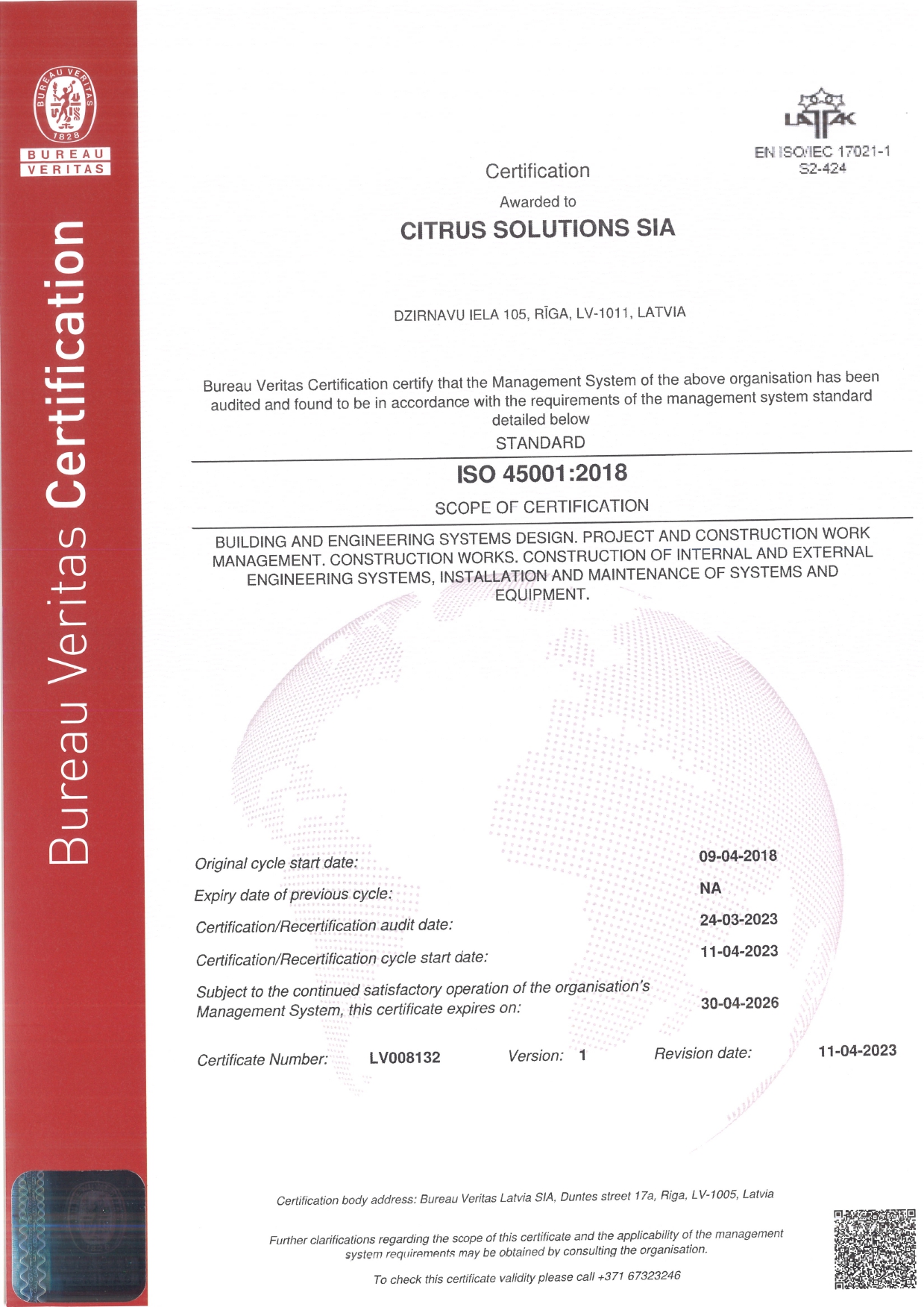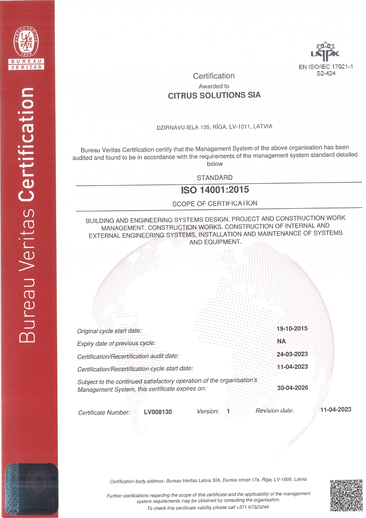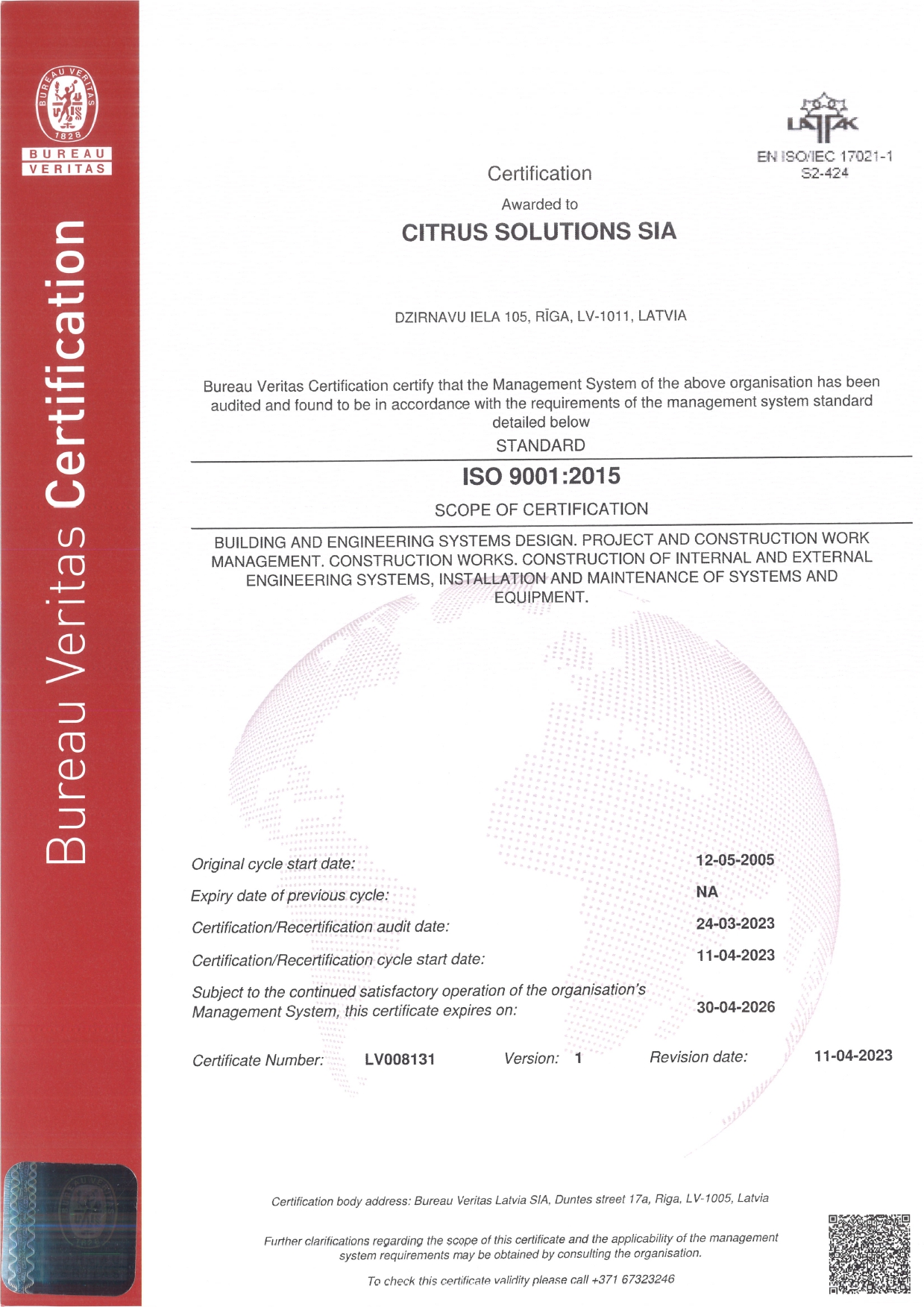 SIA Citrus Solutions Zertifizierungsbereiche: Planung von gebäudetechnischen Anlagen; Projekt- und Baumanagement; Konstruktion; Bau, Installation und Wartung von internen und externen technischen Systemen und Ausrüstungen.