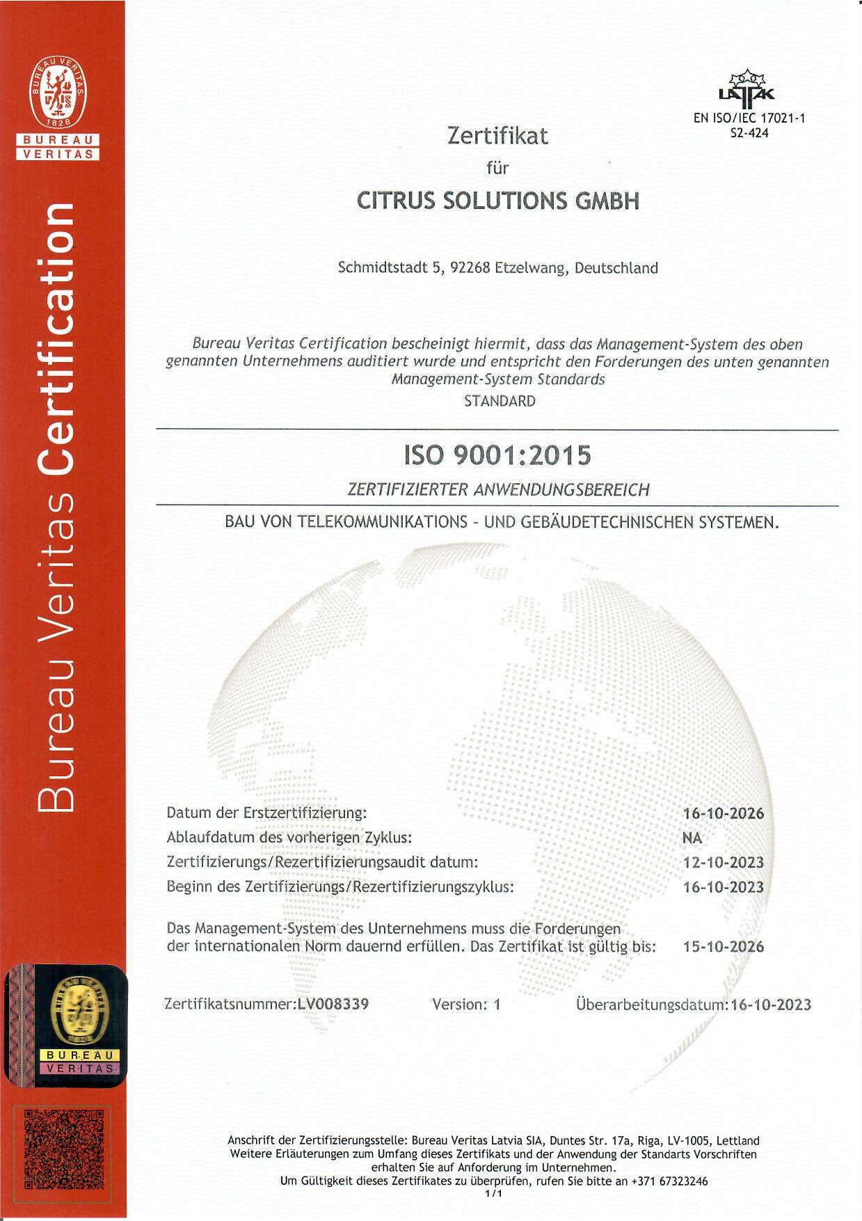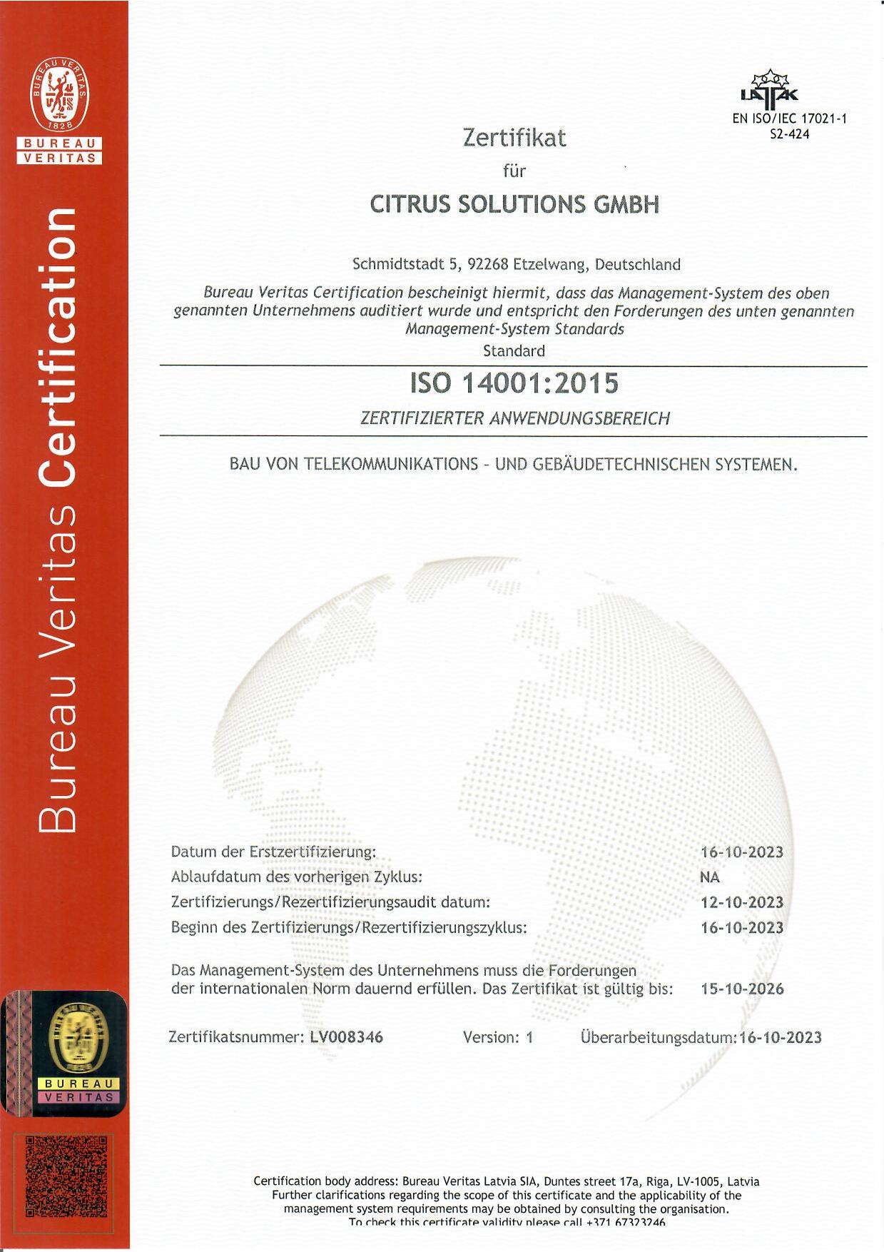 Das Managementsystem von Citrus Solutions ist nach vier international anerkannten Standards zertifiziert – ISO 9001: 2015; ISO 14001: 2015; ISO 45001: 2018 und ISO/IEC 27001:2022.