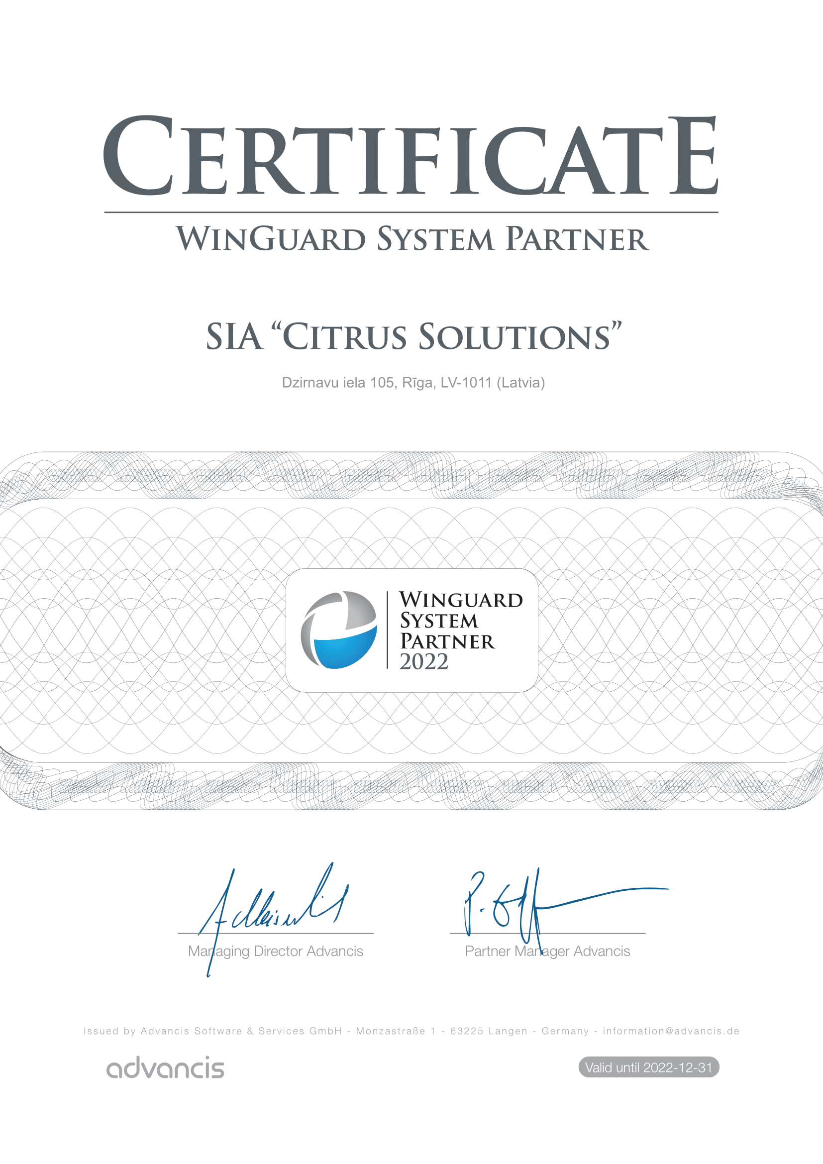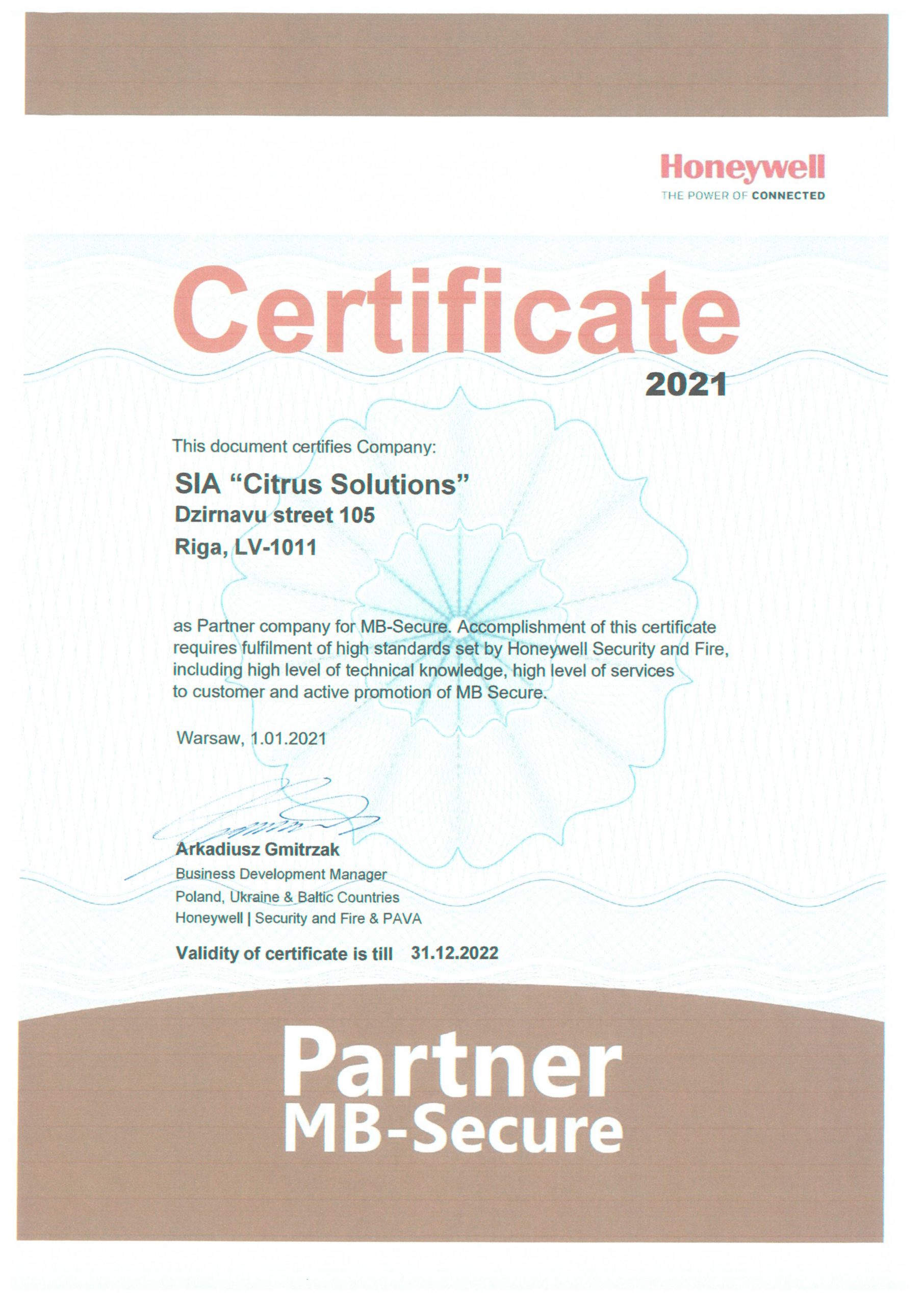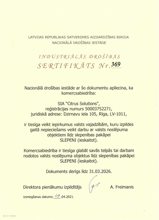 - Kopš 2006. gada SIA Citrus Solutions ir izsniegts Industriālās drošības sertifikāts, kas apliecina uzņēmuma tiesības savas komerciālās darbības jomā veikt darbus, kas satur valsts noslēpumu, starptautisko organizāciju vai ārvalstu institūciju klasificētu informāciju, kā arī uzņēmuma spēju nodrošināt šādas informācijas aizsardzību.
