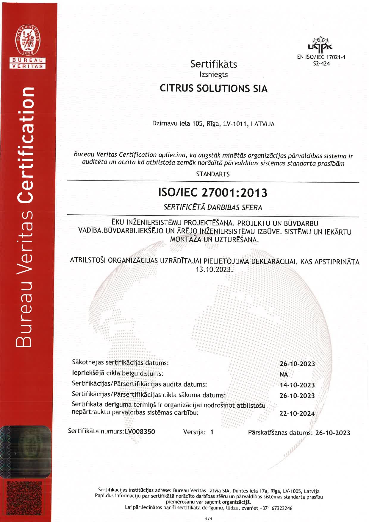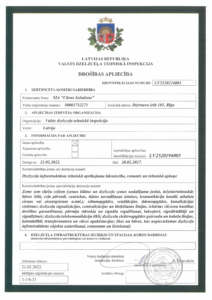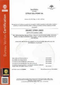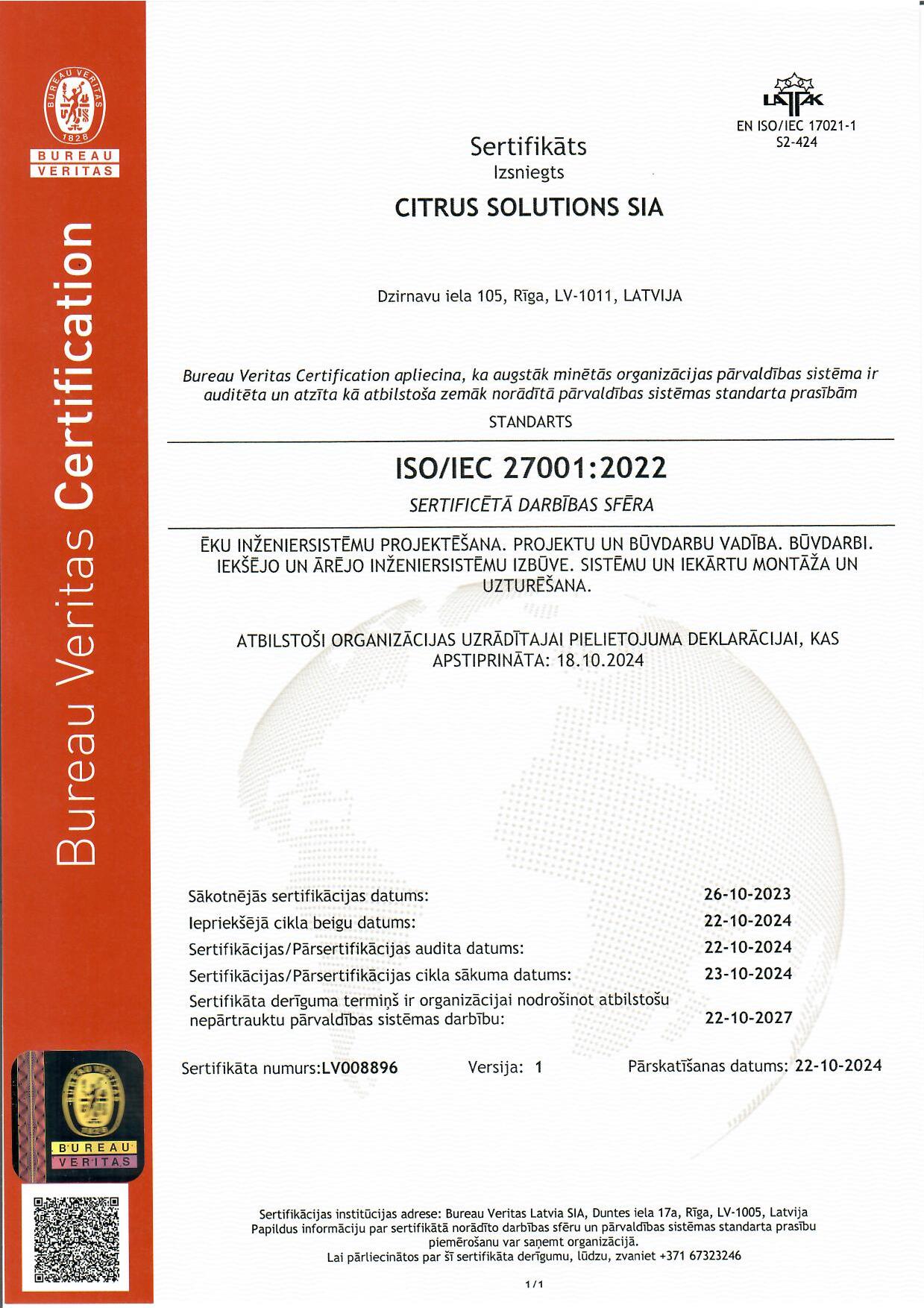 - ISO/IEC 27001:2022 (informācijas drošības, kiberdrošības un privātuma aizsardzības vadība) apliecina, ka uzņēmumā darbojas stabila informācijas drošības sistēma, identificēti informācijas drošības riski un nodrošināti nepieciešamie pasākumi to novēršanai un ietekmes mazināšanai nākotnē.