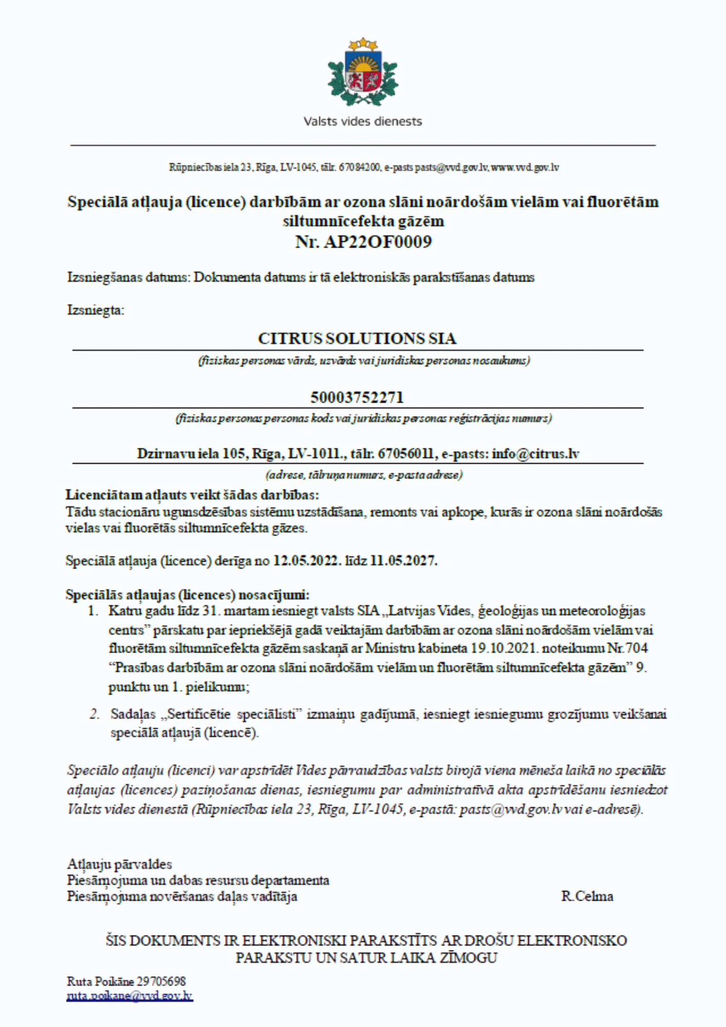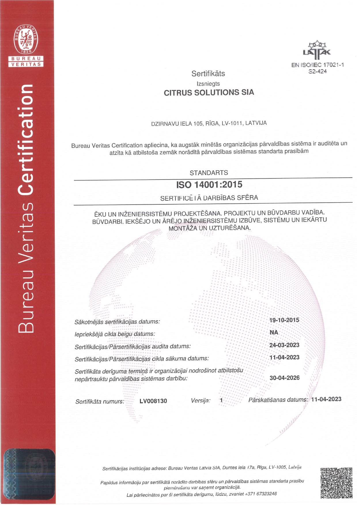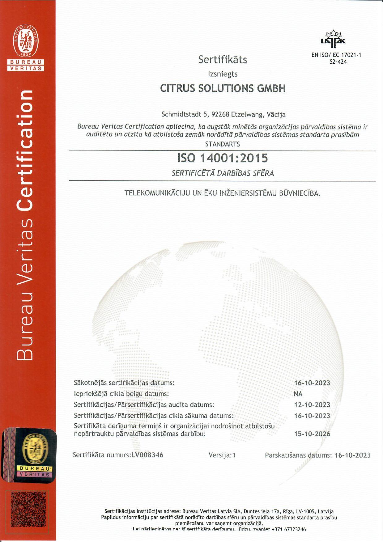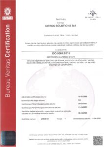 - ISO 14001:2015 (vides aizsardzības vadība) apliecina, ka Citrus Solutions vides vadības sistēma ir vērsta uz to, lai uzņēmuma darbība būtu apkārtējai videi draudzīga, efektīvi izmantojot neatjaunojamos dabas resursus un samazinot gaisa, ūdens un zemes piesārņojumu.