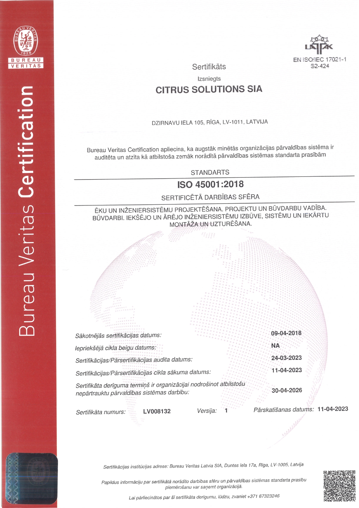 - ISO 45001:2018 (darba aizsardzības vadība) arodveselības un darba drošības vadības sistēmas sertifikāts ir starptautiski atzīts un nodrošina vadlīnijas ar veselību un drošību saistītu riska faktoru novēršanai darbavietā. Atbilstība šiem standartiem ir skaidrs signāls darbiniekiem, klientiem un sadarbības partneriem, ka darbinieku veselība un drošība ir uzņēmuma prioritāte.