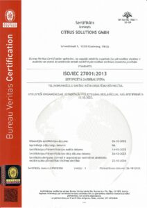Citrus Solutions vadības sistēma ir sertificēta atbilstoši četru starptautiski atzītu standartu – ISO 9001:2015; ISO 14001:2015; ISO 45001:2018 un ISO/IEC 27001:2022 prasībām.
